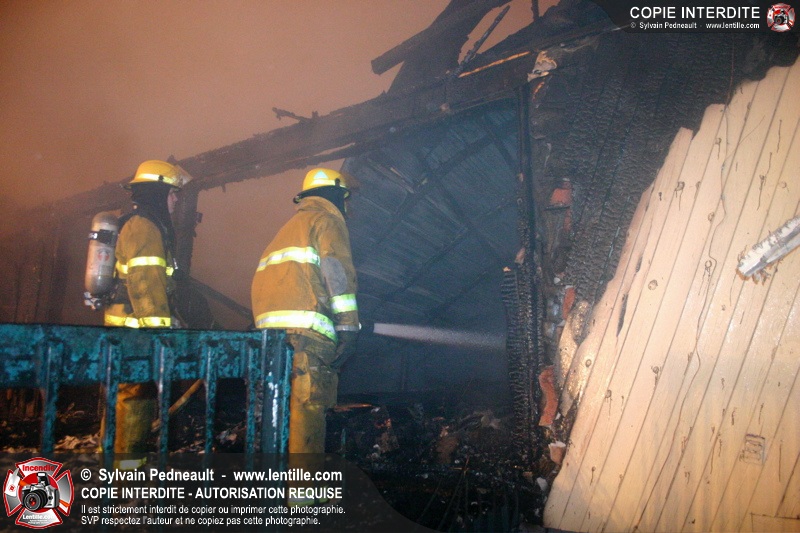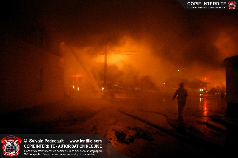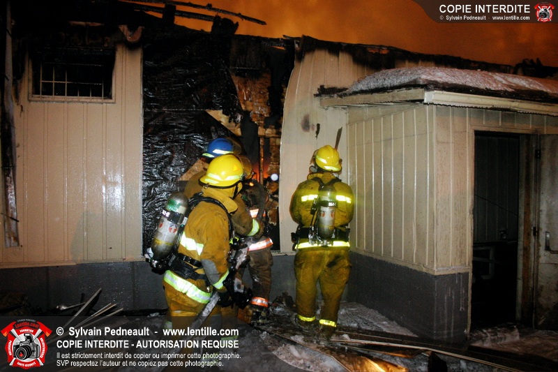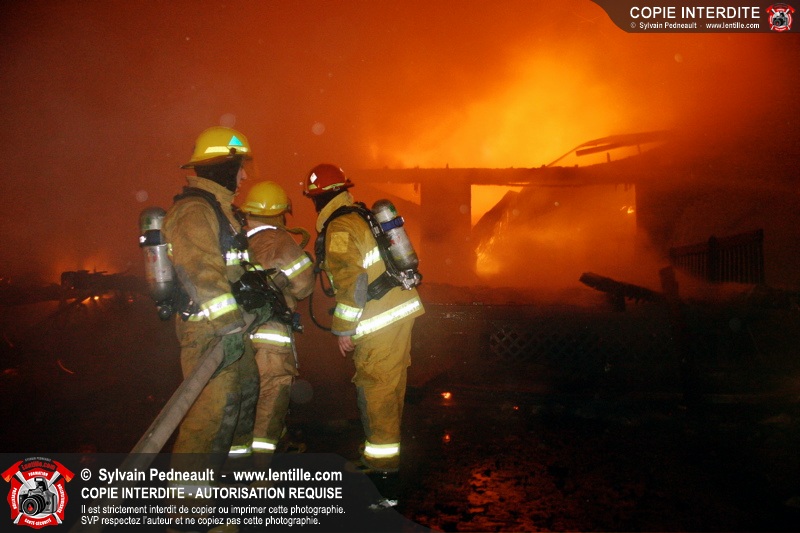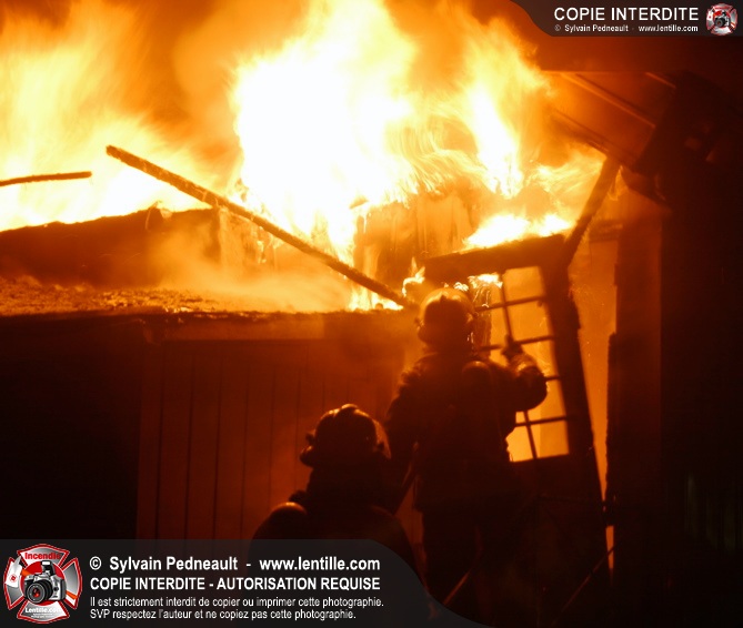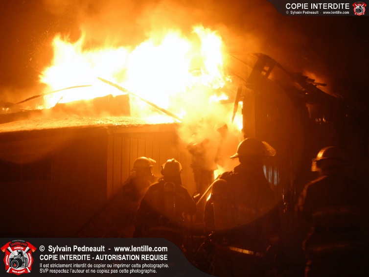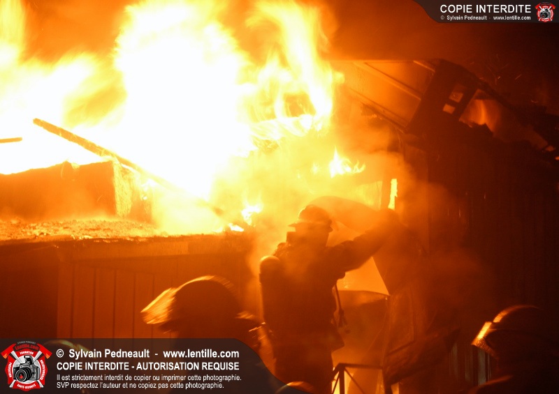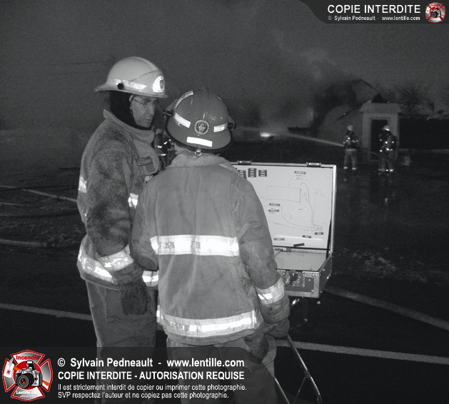 L'unité 205, encore à bonne distance du brasier, donne un 10-07 à la vue des flammes de plusieurs mètres de haut. Étant donné la perte évidente du bâtiment et l'absence de risque de propagation collatérale, une première alarme suffit à combattre le sinistre d'origine suspecte.