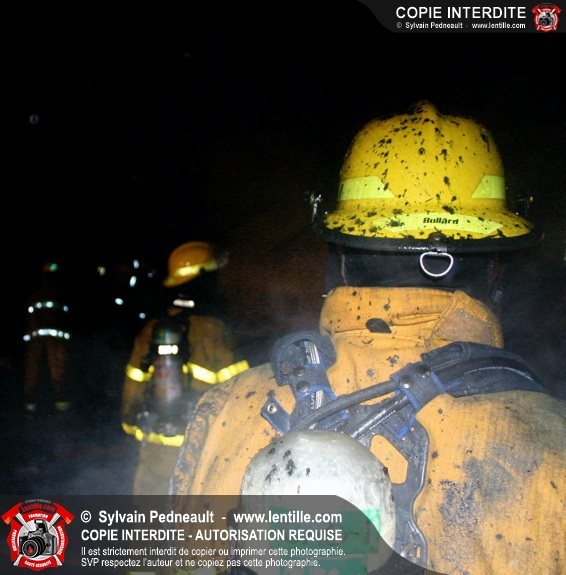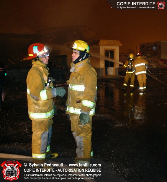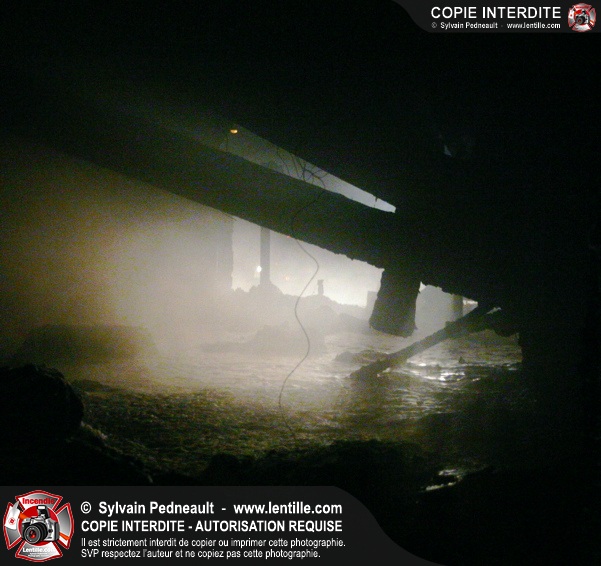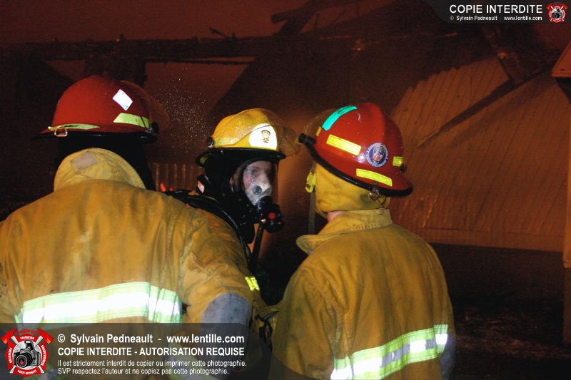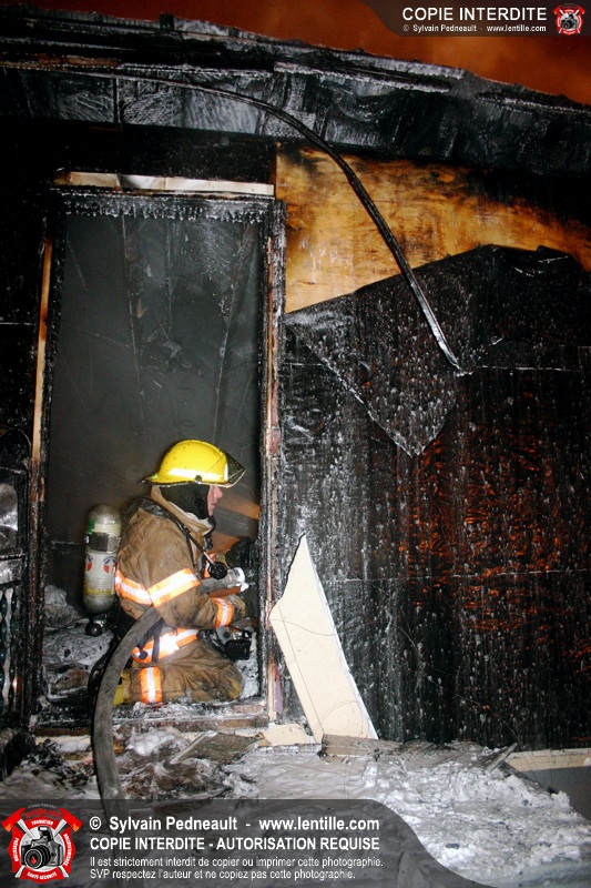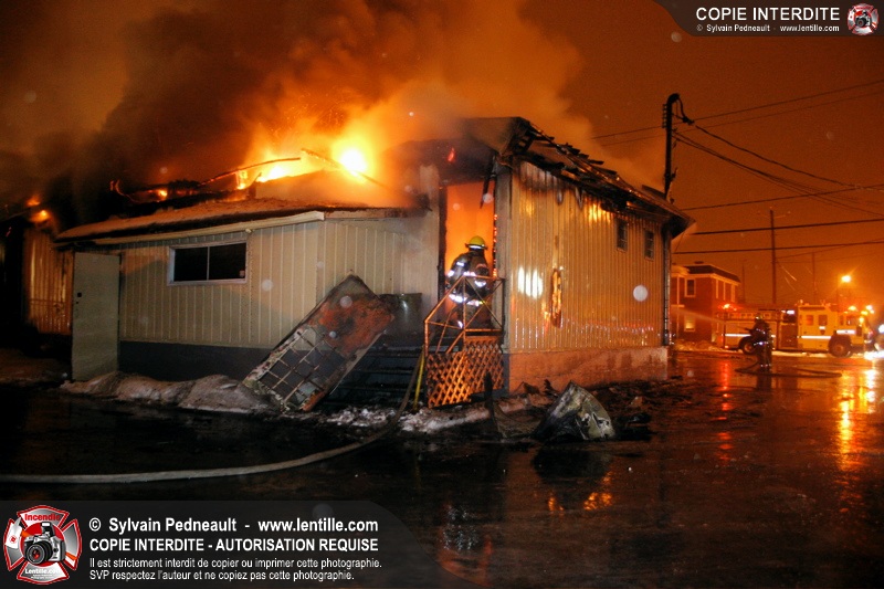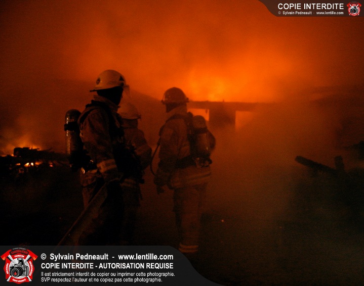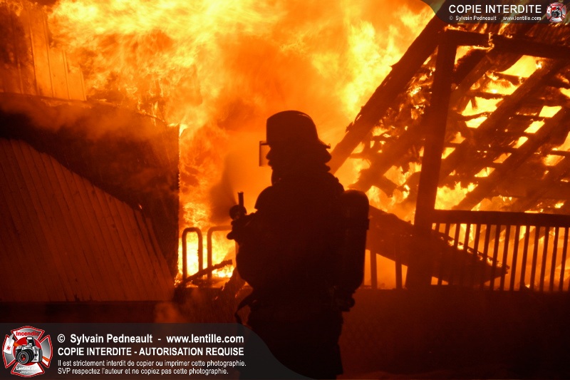 L'unité 205, encore à bonne distance du brasier, donne un 10-07 à la vue des flammes de plusieurs mètres de haut. Étant donné la perte évidente du bâtiment et l'absence de risque de propagation collatérale, une première alarme suffit à combattre le sinistre d'origine suspecte.