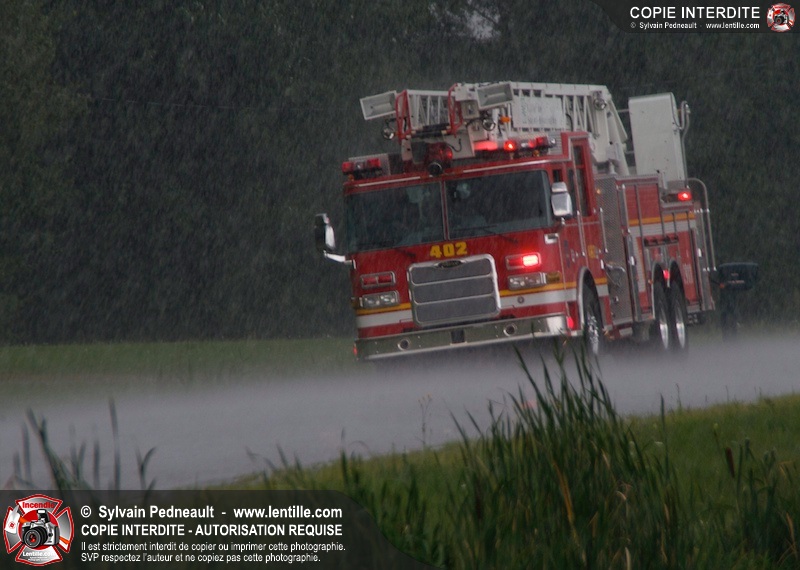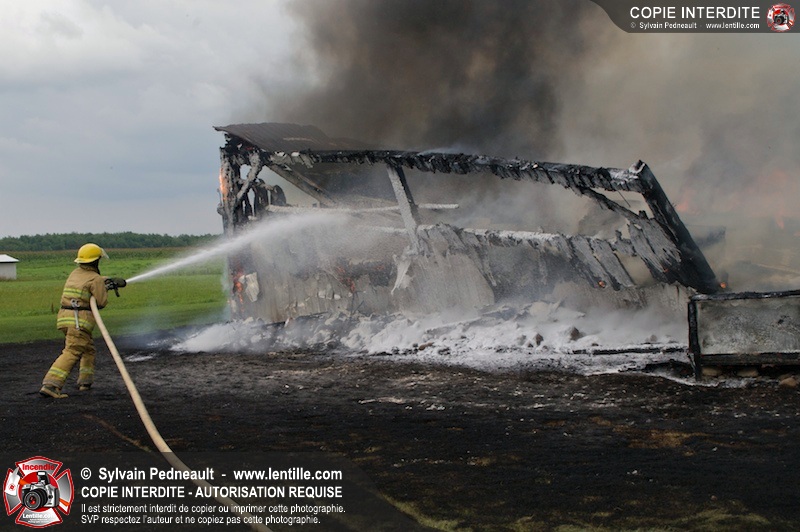 Alors qu'un énorme panache de fumée s'élevait dans le ciel de la Ville, les pompiers de Saint-Hyacinthe convergeaient vers le 5e rang à Ste-Rosalie pour combattre un incendie de grange. À l'arrivée de la première unité, le bâtiment impliqué était embrasé à 100% et menaçait une maison, des véhicules et un garage. Grâce au travail de protection amorcé dès leur arrivée, les pompiers ont pu empêcher la propagation de l'incendie et minimiser les dommages collatéraux.